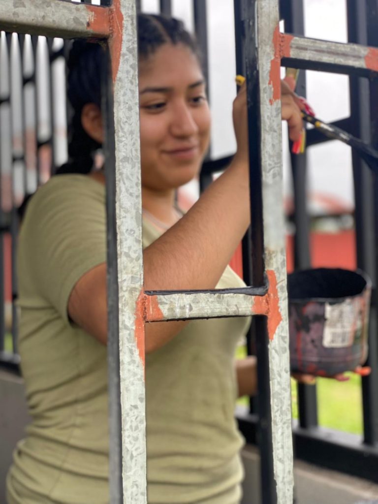 A person paints a metal fence with orange paint using a brush, holding a can of paint in the other hand.