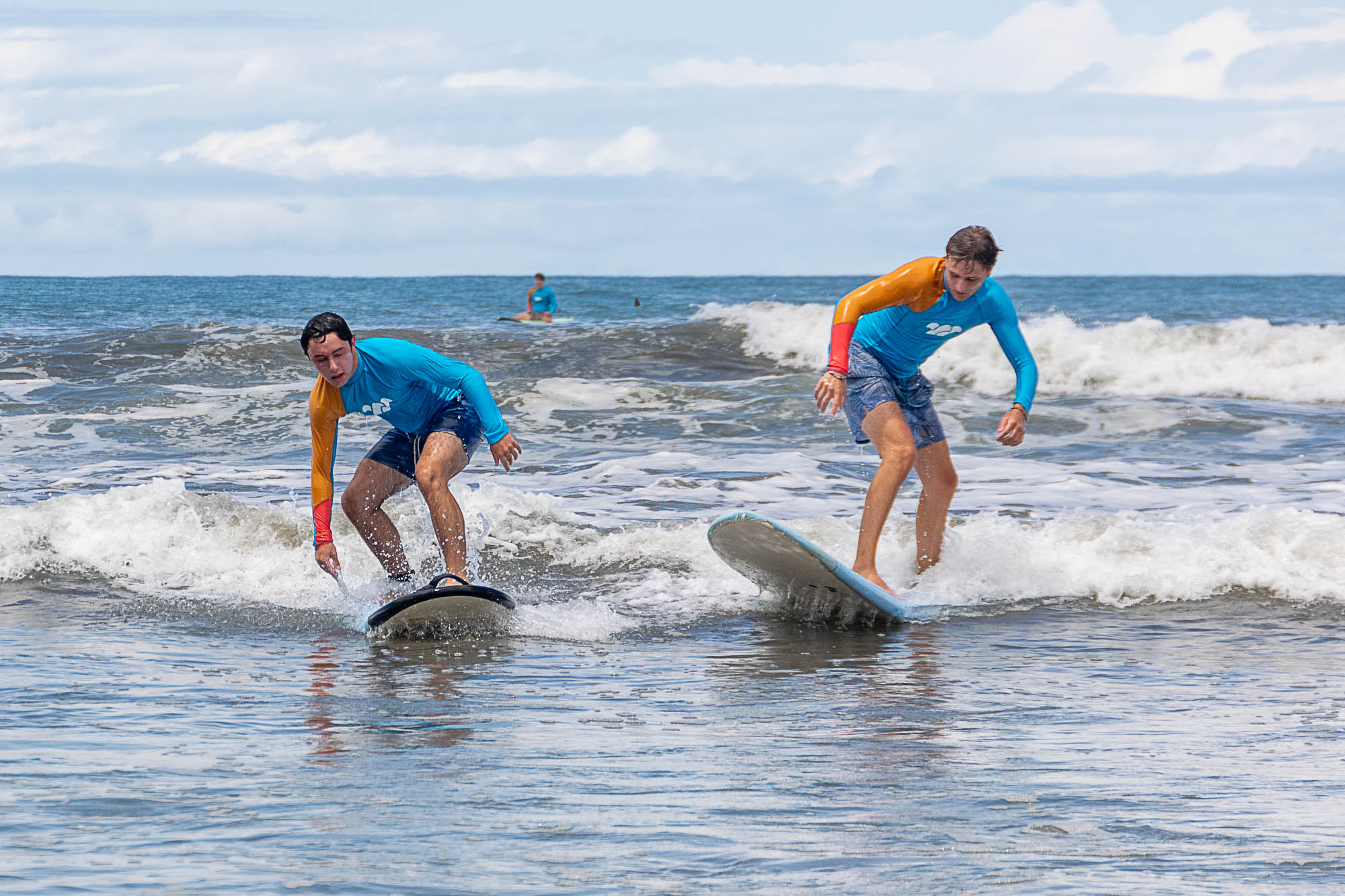 Two people surfing small waves near the shore under a cloudy sky.