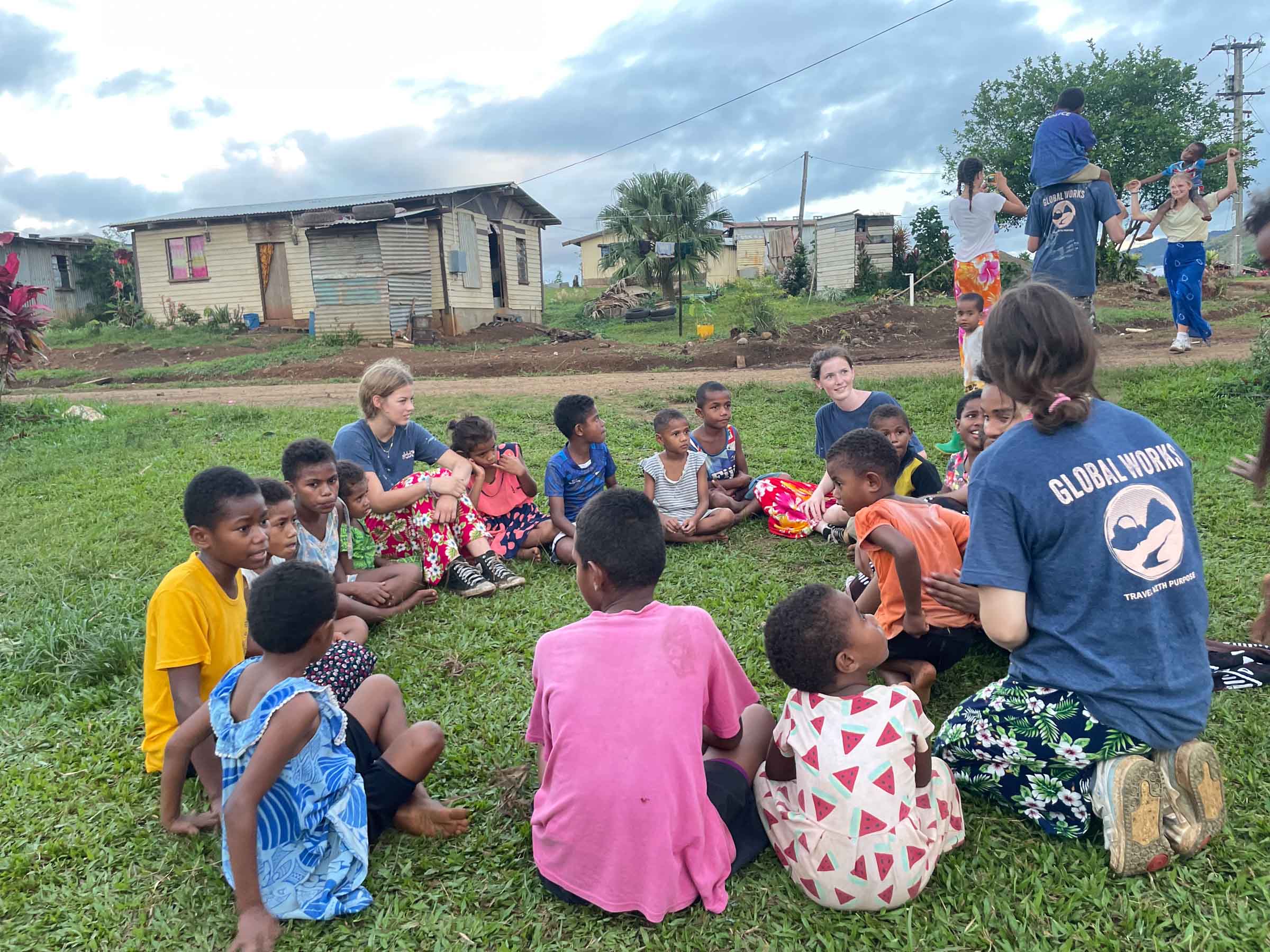 A group of children and volunteers sit on grass in a circle, surrounded by modest houses and trees, under a cloudy sky.