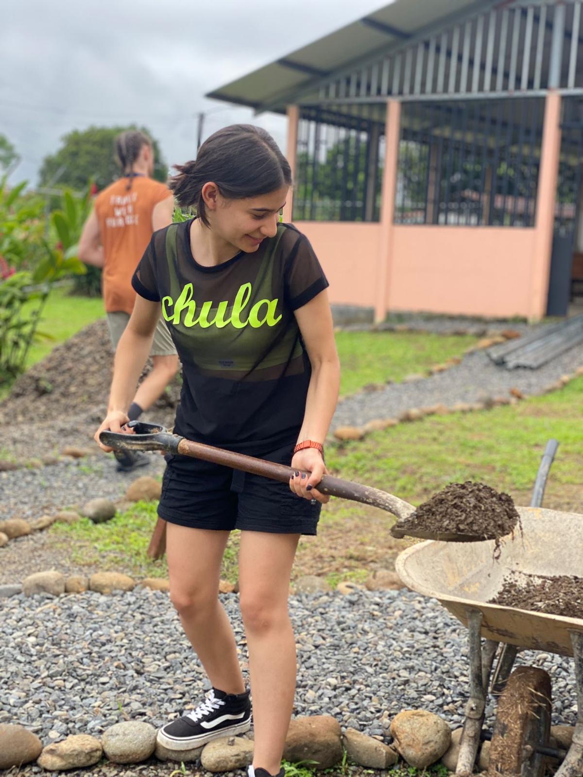 Person shoveling dirt into a wheelbarrow in a garden setting.